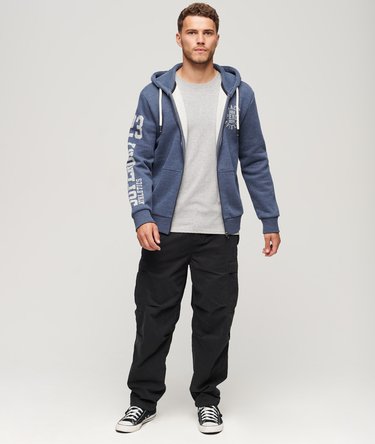 Vintage-style collegiate prints meet with a classic zip-through hoodie design to bring you a look that won't be out of place on the bleachers or on the street. You won't be lost for comfort either, as the soft brushed fabric brings this into the mix.
