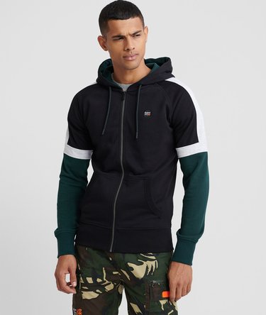 Superdry Collective colour block zip hoodie. This Colour block zip up hoodie is perfect for throwing over those plain white tees to liven up your outfit. Featuring colour block design over the sleeves , a drawstring hood, two front pockets and zip fastening. Finished with a simple Superdry logo to the chest and a Superdry logo tab to the side seam.