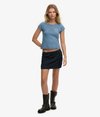 • Signature metal tab above the hemline